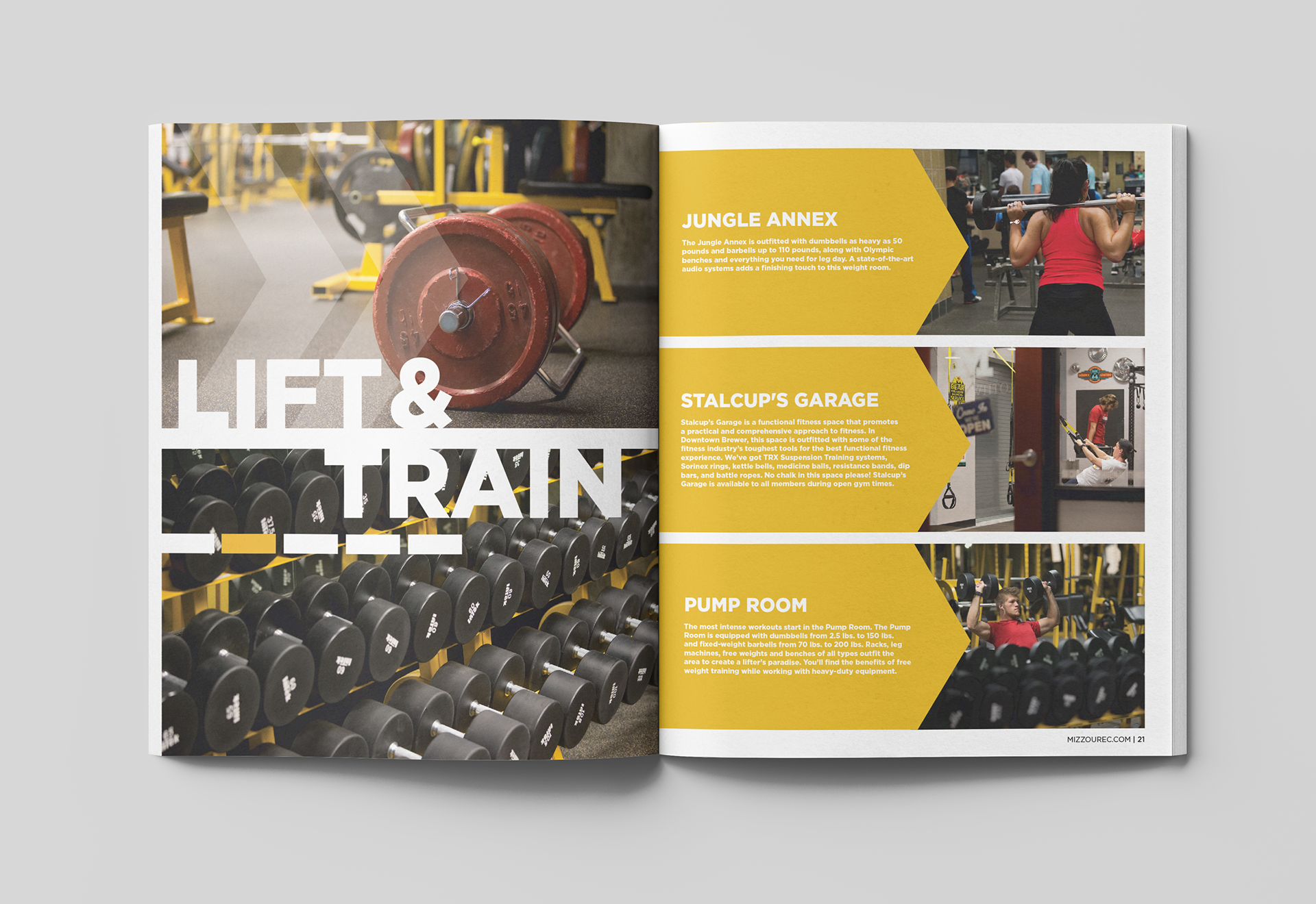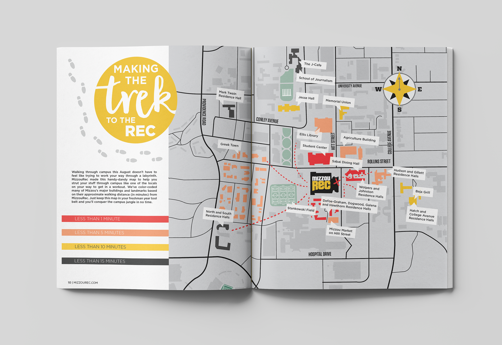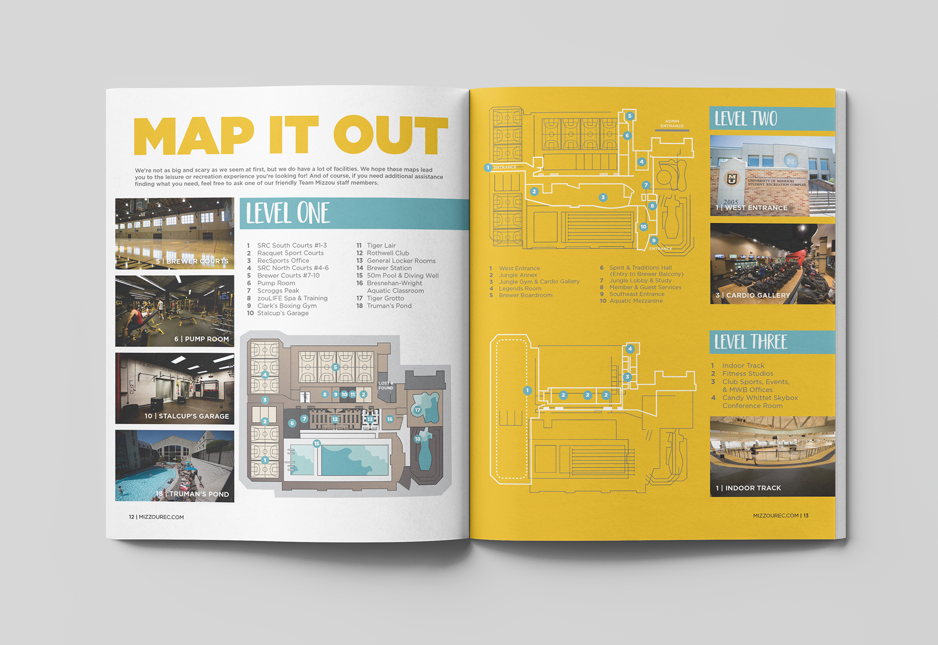 Page design for biannual magazine, MizzouRec Nation. I got to take control of the maps pages and 'spaces' spreads. I've seen a lot more pictures of treadmills than I ever thought I would. Thank you, Nation.