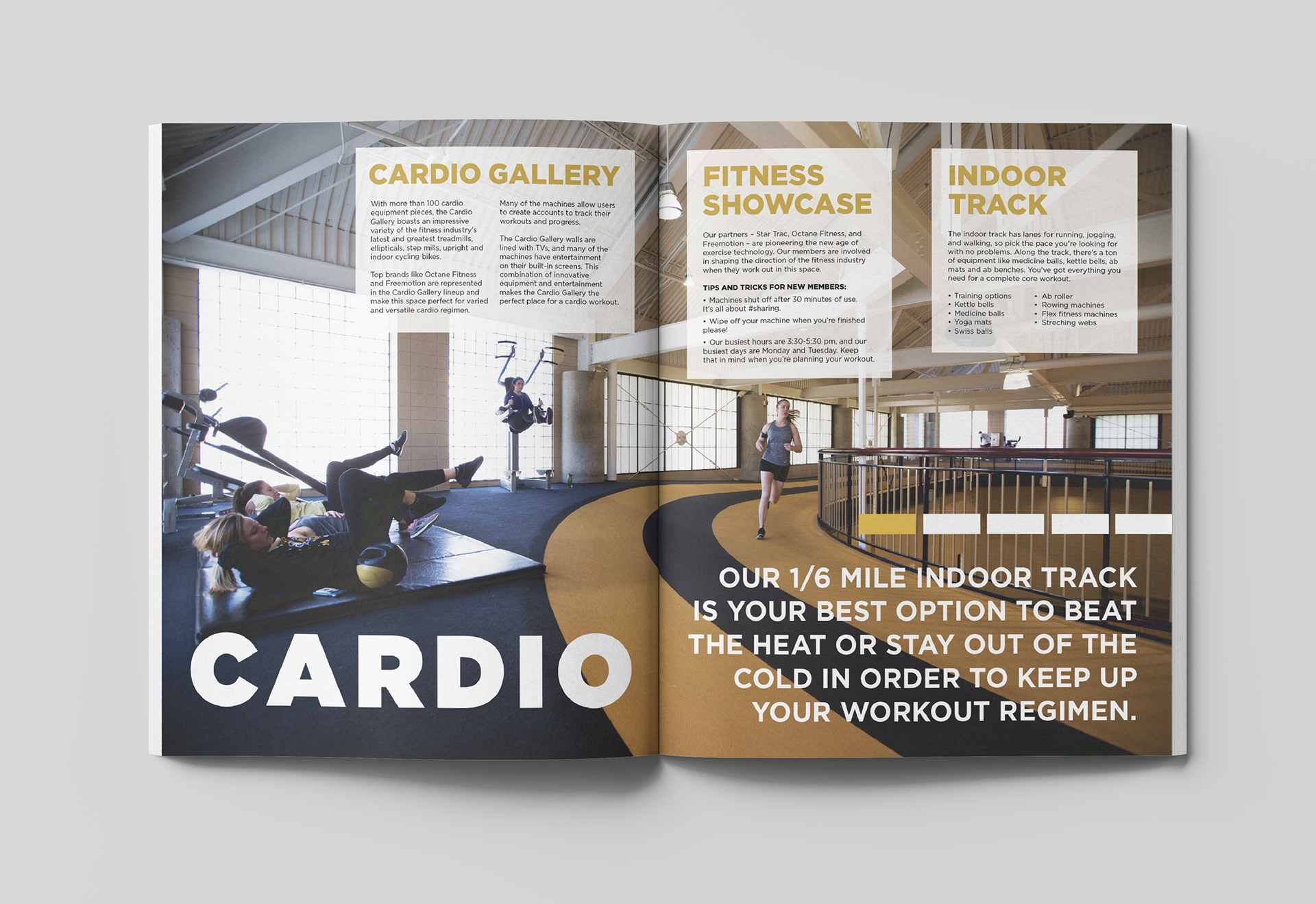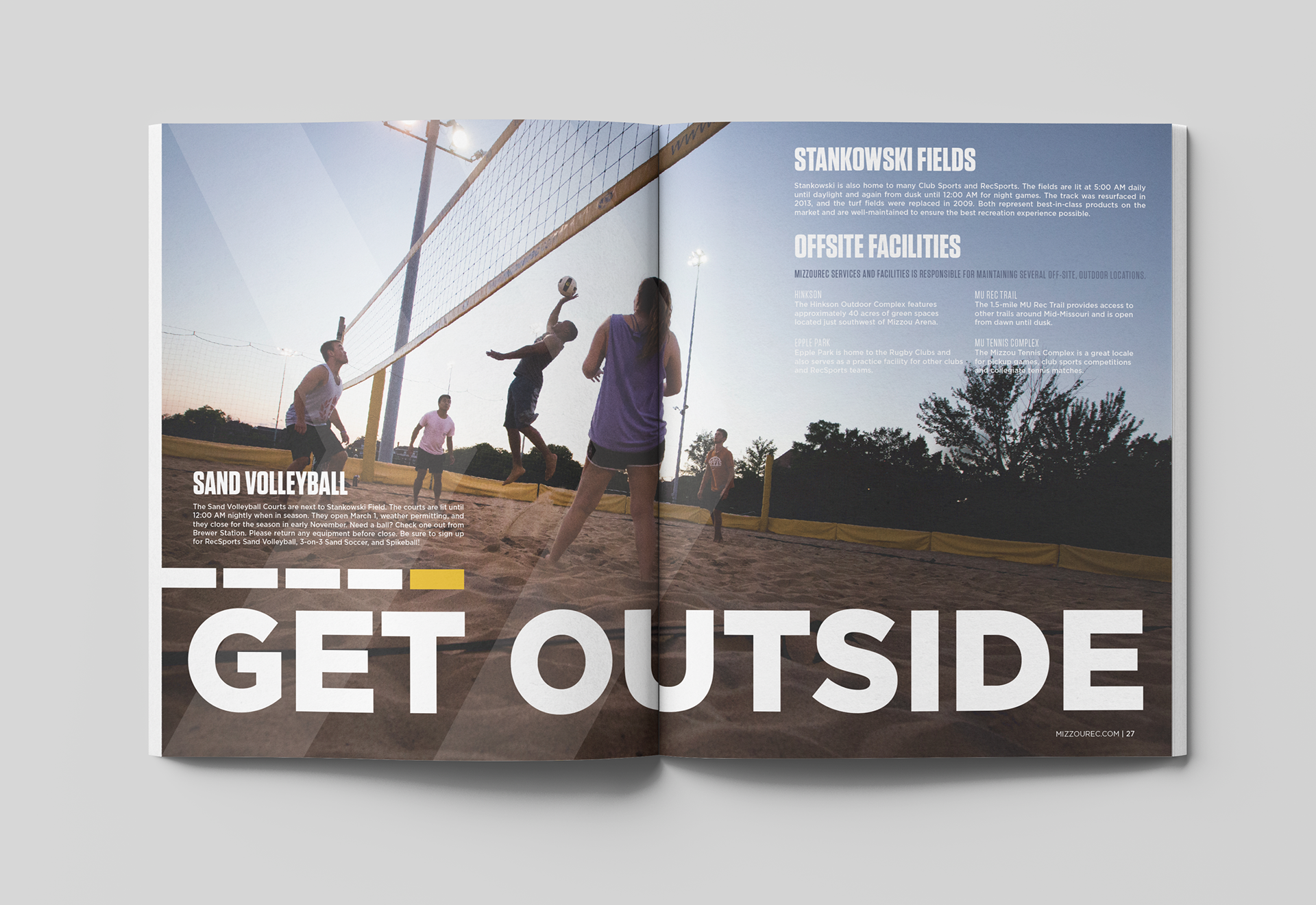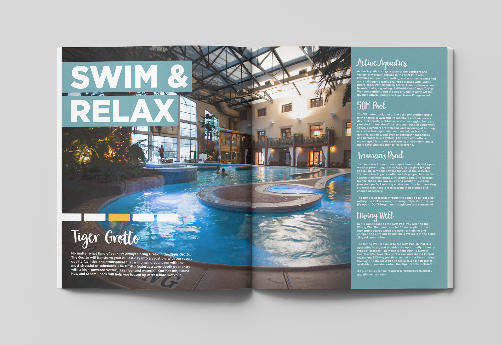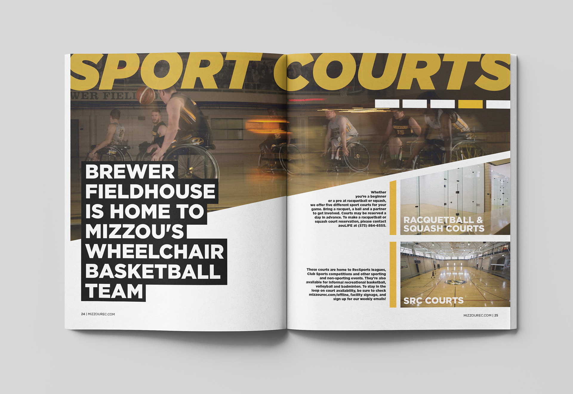 Page design for biannual magazine, MizzouRec Nation. I got to take control of the maps pages and 'spaces' spreads. I've seen a lot more pictures of treadmills than I ever thought I would. Thank you, Nation.
